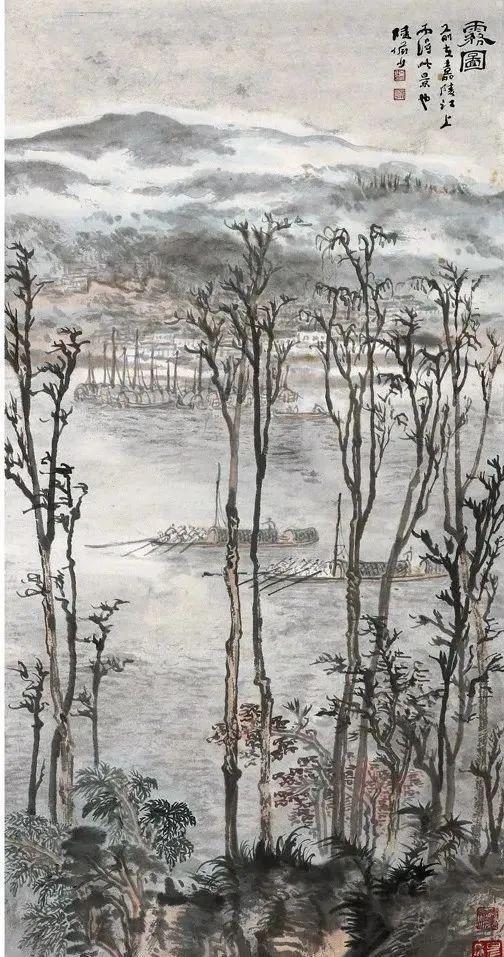 画雾法雾中景色,一片模糊,要在模糊中用淡墨勾出物体,近处稍深,远处更淡。切不可用浓墨,浓则失雾之意。画雾不用浓墨,一片淡墨,勿失于平。所以只有在笔迹的点线上求其不平。如近处山石用大墨块,近树用粗笔,远树用细笔,加以繁简飞疏密、虚实的穿插,同样可以做到不平。画好之后,可用极淡墨水整幅渲染以增加其白茫茫的感觉。